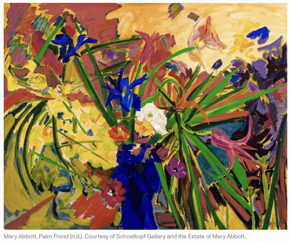 Examples of works from the 1980s show a return to elements of representation, albeit tempered with the language of abstraction Abbott had mastered over the decades prior. Living on Long Island, Abbott immersed herself in nature and found it a potent source of inspiration. Palm Frond, though undated, likely hails from this period and displays expressionist brushwork but a more careful approach to arrangement and elements of perspective.