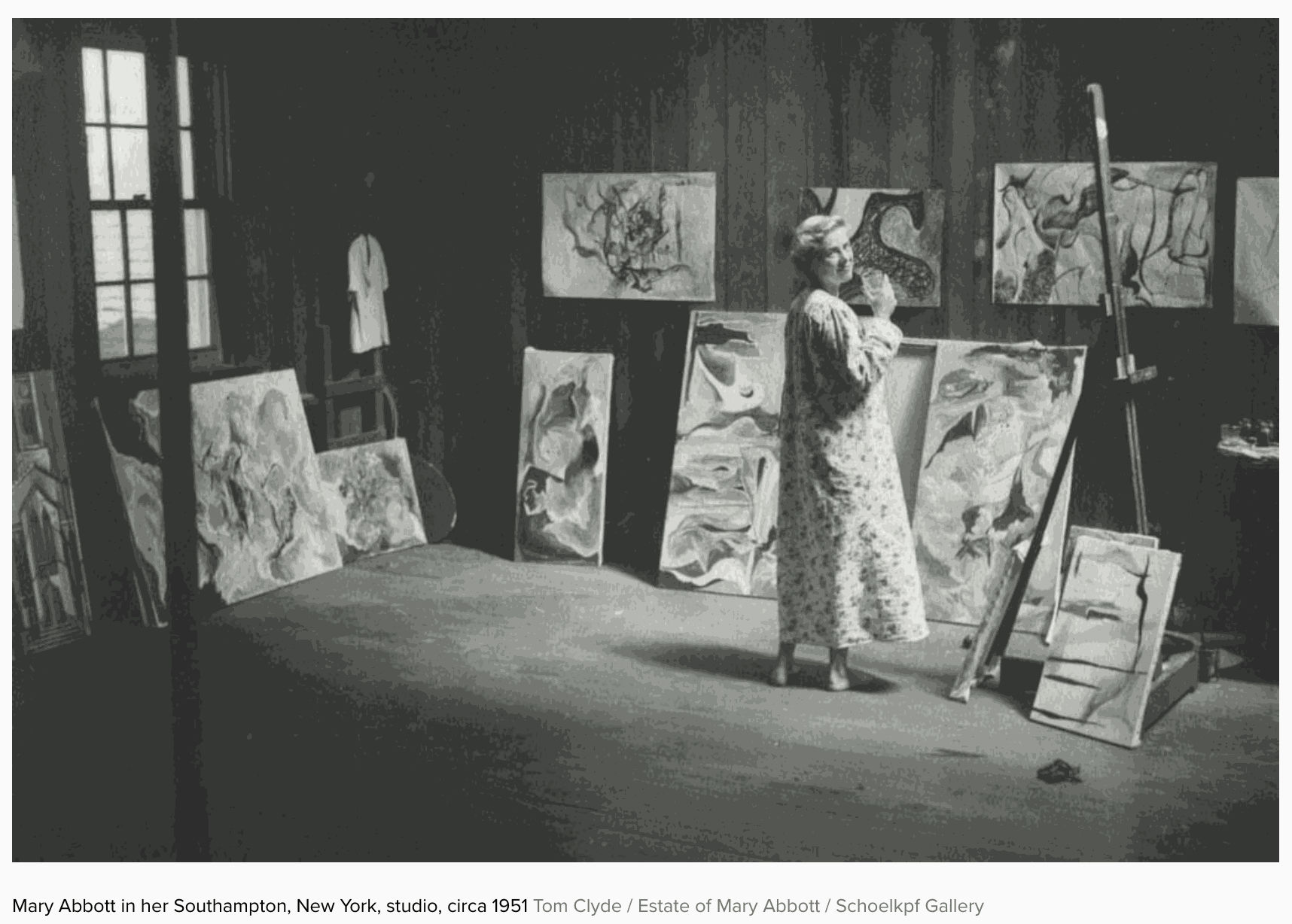 She soon left his tutelage in favor of David Hare, a neighbor and one of the founders, alongside Rothko and others, of the experimental Subjects of the Artist school. After moving to a flat in the East Village, Abbott worked and socialized with an avant-garde milieu, including the de Koonings and Pollock.