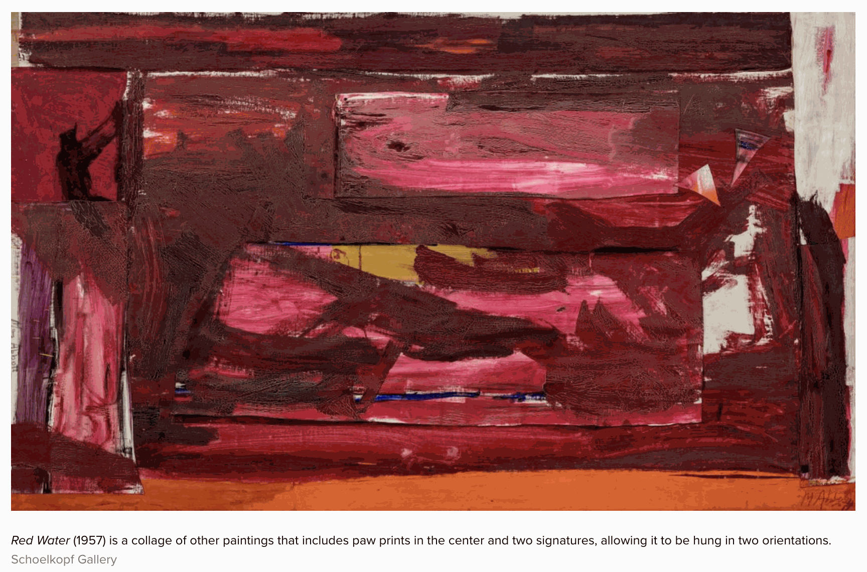 She began experimenting with materials and media, using pastel, oil paint, charcoal and collage combined with hand and paw prints from her dogs, according to a gallery guide. Process, for Abbott, was as important as the finished painting, which might go some way in explaining why most of the more than 60 paintings featured in the exhibition are Untitled.