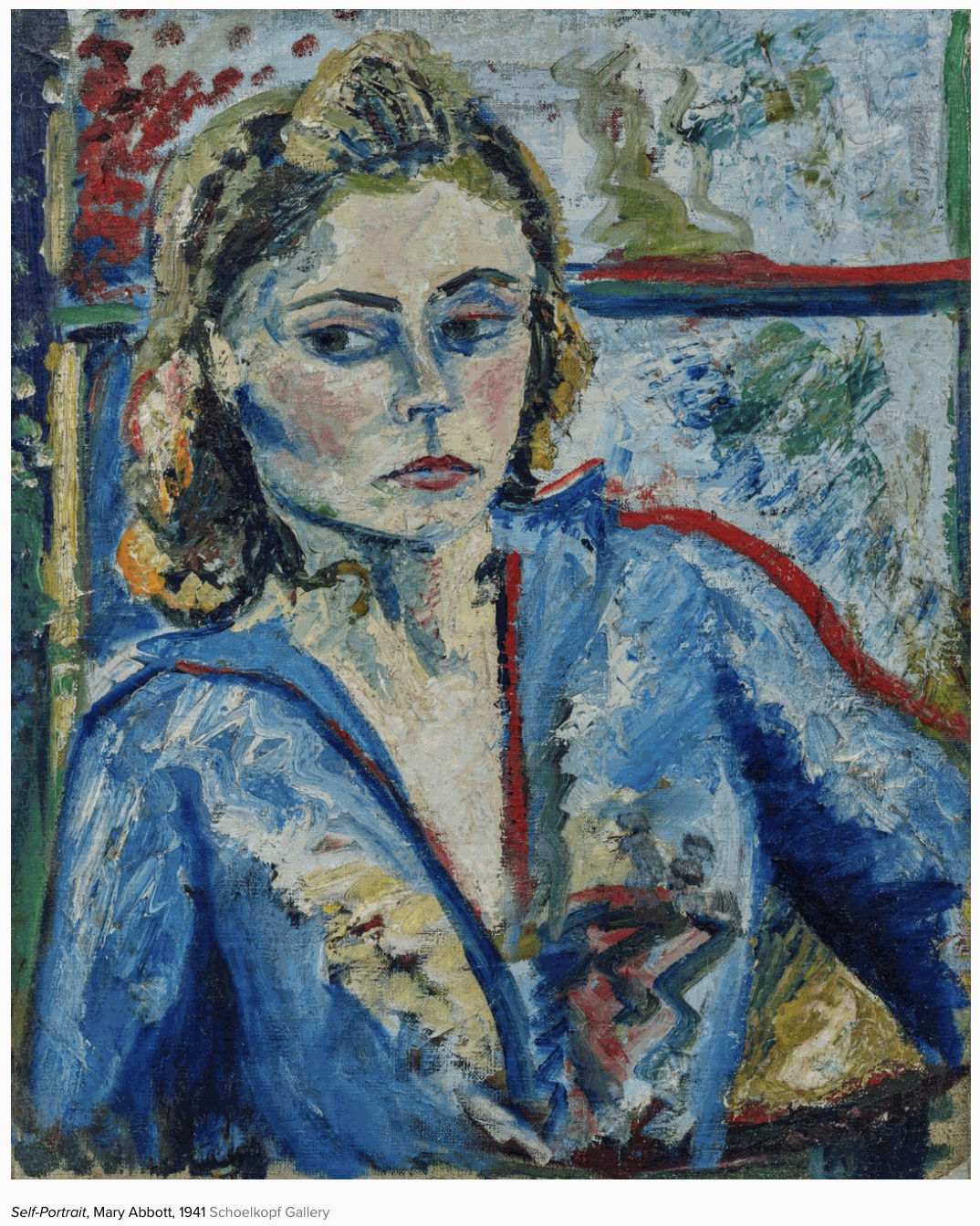 Recognizable objects are rare in her work, although two self-portraits serve as fitting “bookends” for the show, per Artnet’s Annikka Olsen. The first, from 1941, shows the artist, a former model for Vogue and Harper’s Bazaar, with blond hair and tight red lips, which are mirrored by abstract golden-brown coils and red highlights around her blue top and the blue background.