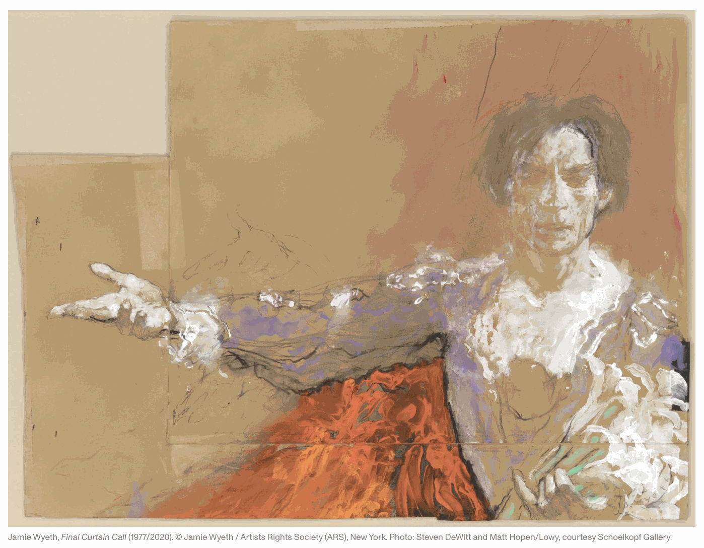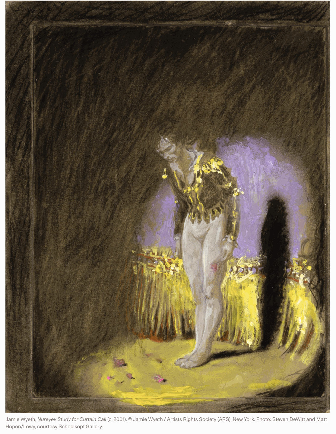 Still, Wyeth's compositions bear out Nureyev's phenomenal grace, physicality, and mystique. In one, he extends a hand in a dramatic gesture; in another, he appears poised with his arms splayed as if ready to leap. In a study for the 2001 painting, Curtain Call, Nureyev is seen mid-bow in a scene infused with pathos.